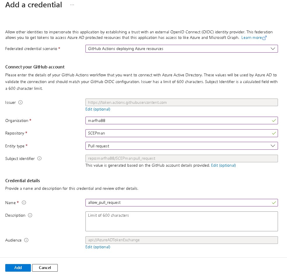 Add at least 2 federated credentials with federated credential scenario: Github Actions deploying Azure resources.