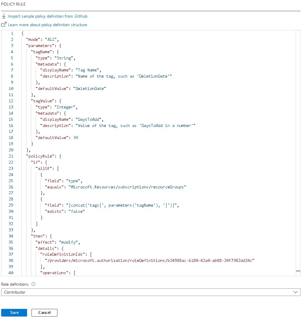 Script/json file for the role Tag Creator can be found here: tagcreator.json But remember to change to your management group