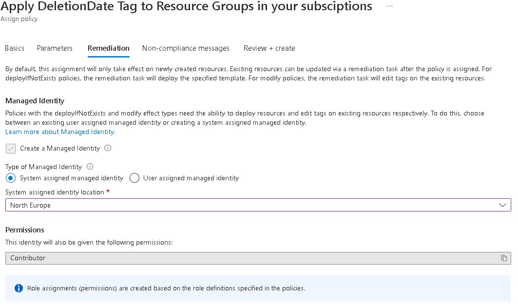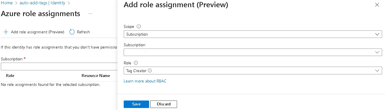 Add RBAC I have created a custom role you can use: Tag Creator see bottom. (But you can use for example Contributor) You can add the RBAC for the automation account to more subscriptions if needed. It should look like the image below.