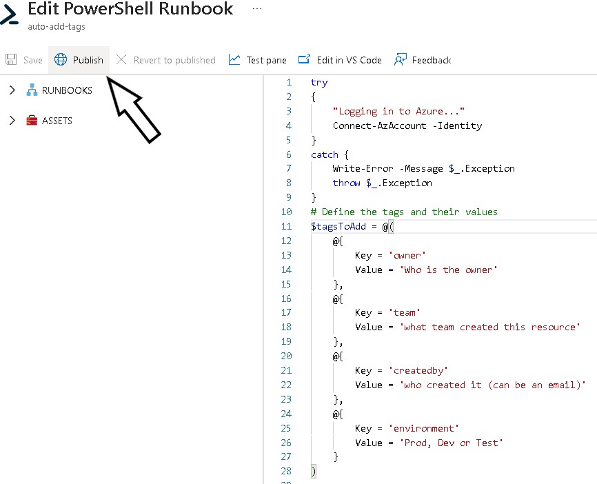 If you are satisfied with the test run, then go back to edit the Runbook/script or want to continue click on Publish.