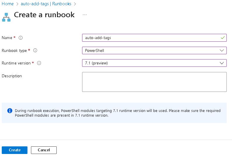 Give the runbook a meaningful name, set Runbook type PowerShell and Runtime version 7.1 (perview) and click Create.