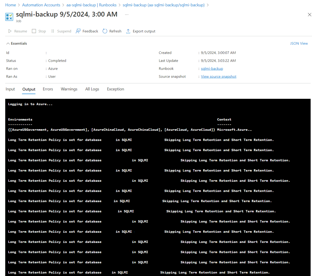 Runbook Deployment: The script deploys a PowerShell-based runbook to the automation account. This runbook contains the logic to apply backup retention policies to all SQL Managed Instance databases. The runbook is responsible for: